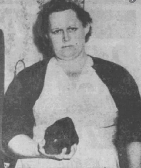The rocky fireball was visible in three states as it streaked across the sky. If it hadn’t been slowed down by both the roof and the radio, it would have ghosted Ann’s ass. With Cold War paranoia running hot, the police chief confiscated the meteorite and gave it to the air force. Ann’s landlord said it hit my property, so it’s my rock. Ann eventually got it back, then donated it to the Alabama Museum of Natural History in 1956. Ann’s husband said the stress of the international attention of the story put his wife in an early grave. She died aged fifty-two from kidney failure.