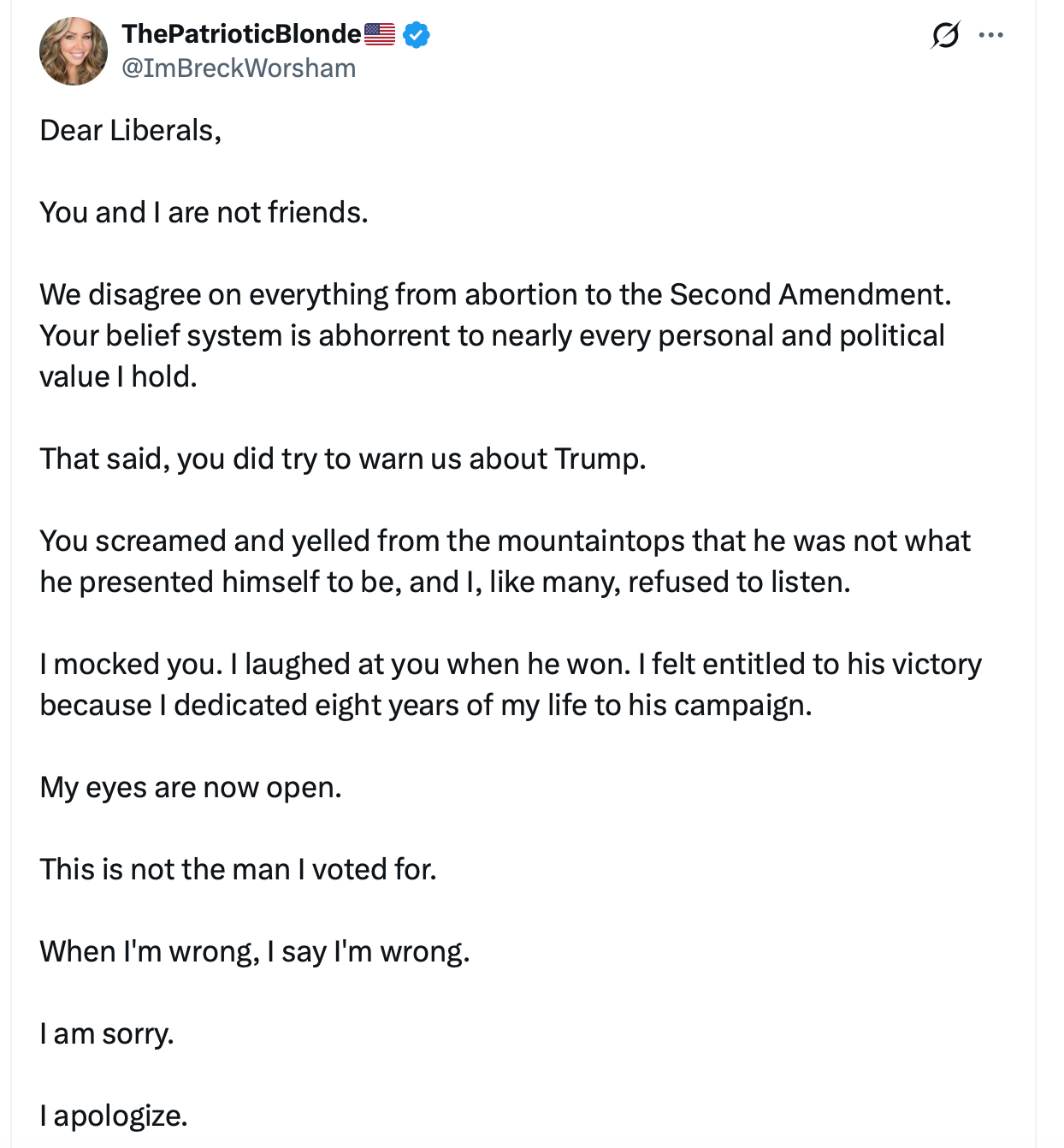 So now she just hates Trump but is okay with everything project 25, Vought, Miller stands for, and “you’re not “friends” with us. Duh